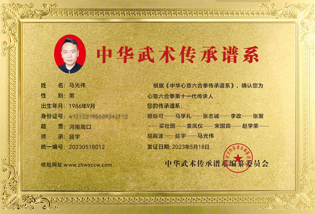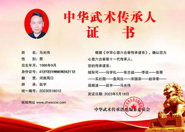 马光伟,1986年生,河南商水人,师承延宇——心意六合拳第十一代传人,武术协会理事成员,荣获优秀教练员荣誉称号。