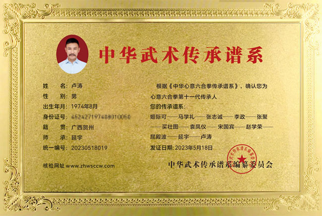 卢涛,1974年生,安徽蚌埠人,师承延宇——心意六合拳第十一代传人,武术协会理事成员,荣获优秀教练员荣誉称号。