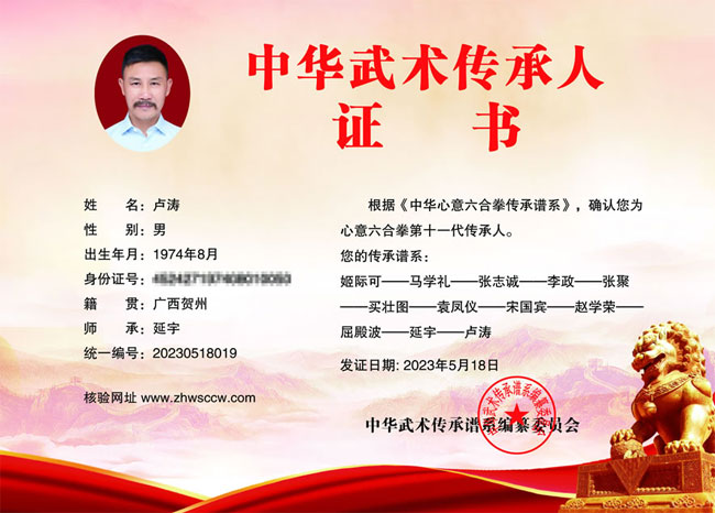 卢涛传承证书