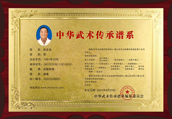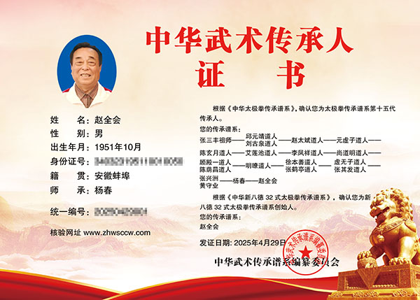 赵全会祖籍安徽蚌埠,出生于 1952 年,自幼体弱多病又酷爱武术,力求强身健体,青年云游四方,广交善缘,走访各派武学名家、宗师,后拜张三丰嫡系第十四代传人杨春大师为师。磨砺生活的艰辛,练就乐观的人生,参悟武学太极真谛,集各家所长,成一代拳师,在研习与悟道武学太极中,缘识一代宗师张山老师,受他尚武精神影响,随提出“习武修德,厚德载物,德行天下”武学思想,并自创“新八德 32 式太极拳”。这是一套简单易学,育人修德与强身健体相结合的全新拳种,现已在全国普及推广,造福华夏儿女。
