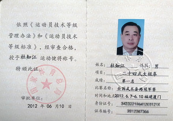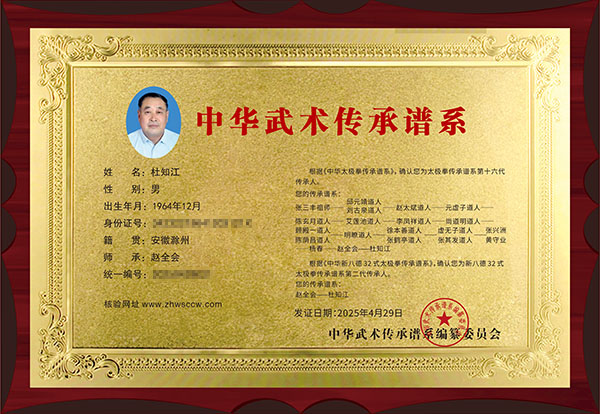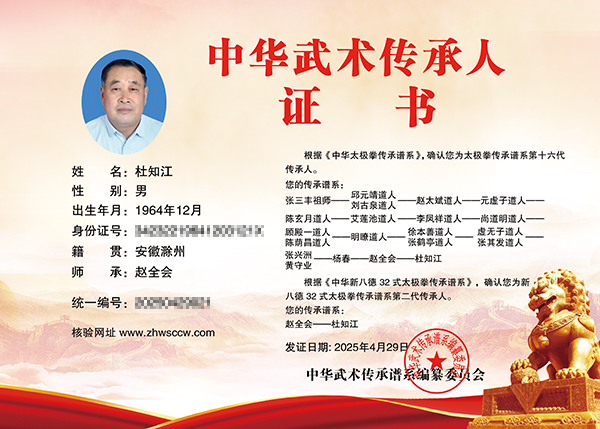 杜知江:男、 汉族,1964年生于安徽省滁州市、中共党员、中共中央党校硕⼠研究生,陈氏太极十一代、杨氏太极第六代、张祖太极十六代传人。