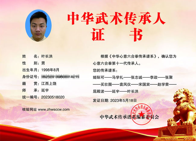 叶长洪,1998年生,江西上饶人,师承延宇——心意六合拳第十一代传人,武术协会理事成员,荣获优秀教练员荣誉称号。