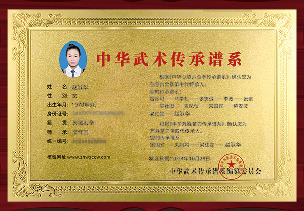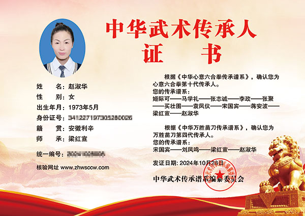 赵淑华:女、1973年5月出生,亳州市利辛县人大代表,是太极拳、健身气功国家级社会体育指导员推广者,现任亳州市太极拳协会副会长,利辛县太极拳协会秘书长,健身气功五禽戏推广中心副秘书长,安徽省武术一级裁判员,安徽省健身气功一级裁判。习武健身传承二十五年、陈式太极拳第十三代传人,八卦掌传承人。师承梁红宣,系心意六合拳第十代传承人、万胜苗刀第四代传承人。
