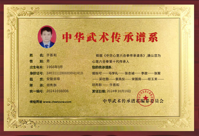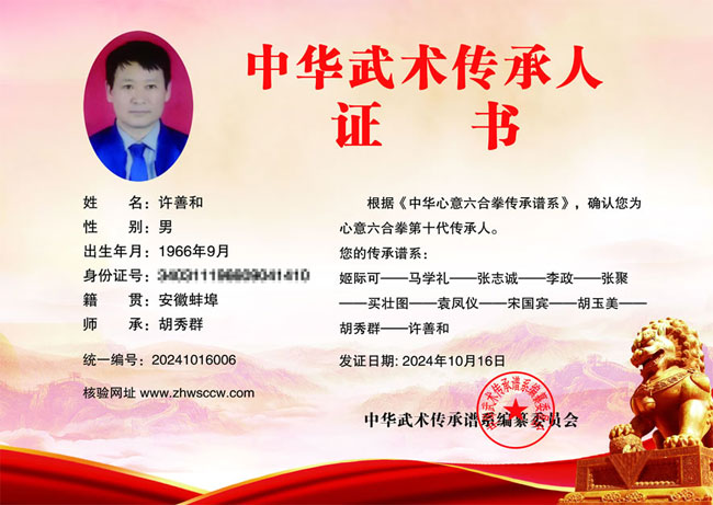 许善和1966年9月出生蚌埠,中国武协会员,蚌埠市武协常武协先进个人,社会体育指导员,优秀教练员、运动员,委蚌埠武协善和武学社会长,蚌埠宋门心意拳优秀传承人。