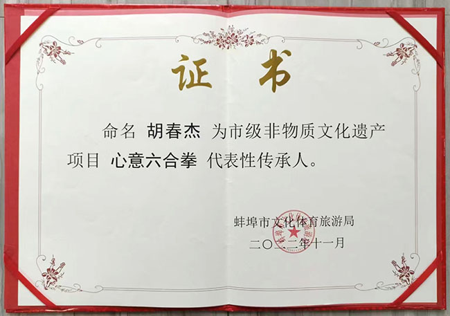 2021年11月被蚌埠市文化旅游局授予市级非物质文化遗产项目【心意六合拳】代表性传承人。