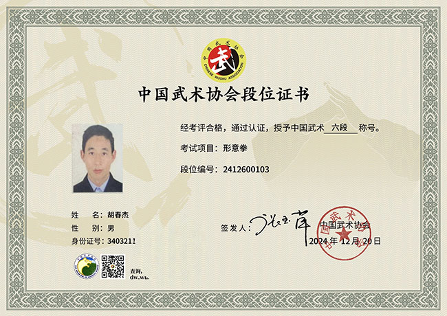 胡春杰:男,1969年4月出生,汉族,中共党员,大专文化,系心意六合拳第十代传承人。自幼喜欢武术,中学时代曾经自学过少林小洪拳。1986年至1991年在部队练习军体拳并担任过军体拳教练。1992年在怀远县公安局防暴队练习擒敌拳、警体拳,后拜蚌埠宋门心意六合拳总会会长李玉安师父练习心意六合拳至今。