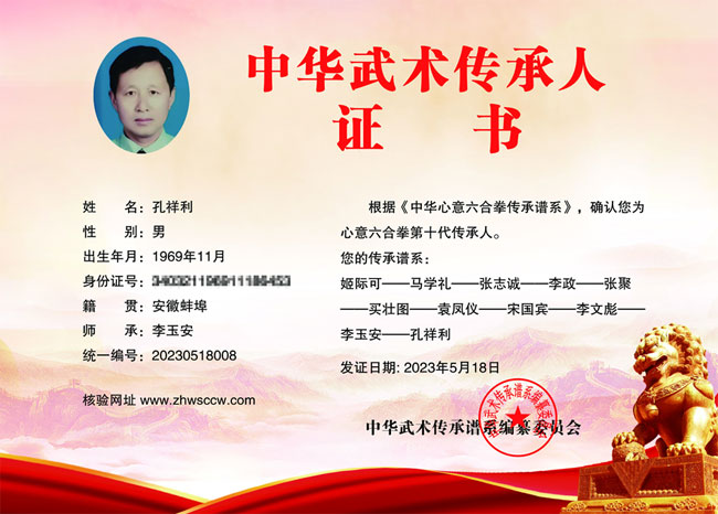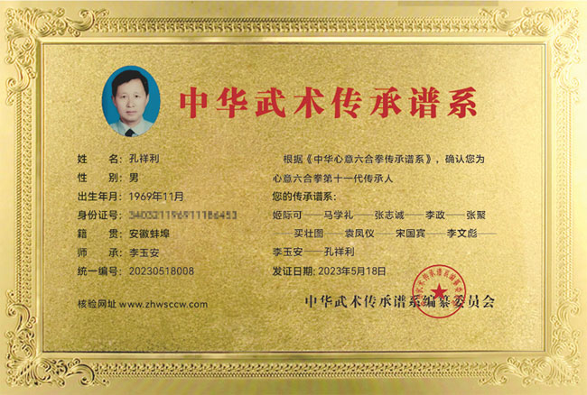 孔祥利,1969年生,安徽蚌埠人,师承李玉安一心意六合拳第十代传人,目前就职于交通公司,武术协会理事成员,荣获优秀教练员荣誉称号。