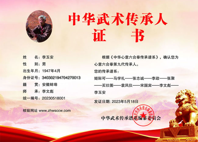 李玉安,1947年生,安徽蚌埠人,宋门心意六合拳总会会长,荣获【心意名家】的荣誉称号。