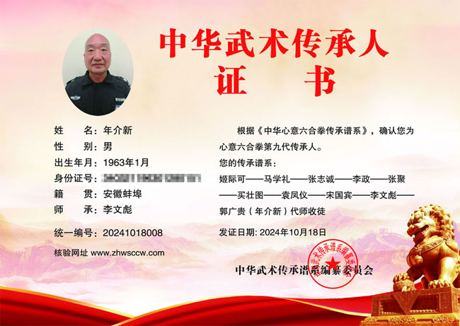 年介新:1963年1月出生,自幼习武,习练过洪拳、形意拳、八极拳、心意六合拳等。1981年跟随郭广贵师兄(替师带徒,师承李文彪)练习心意六合拳至今。是蚌埠市武术协会郭广贵心意拳武馆怀远总教练,蚌埠市武术协会怀远亚太集团武术分会副会长,吴锺八极拳研究会怀远县副会长。曾多次参加过省内外武术比赛,其中心意拳、青龙刀、月牙铲、六合刀在比赛中多次获金牌。2024口子窖杯安徽省第十四届传统武术比赛中,心意六合拳,六合刀分别荣获银牌。