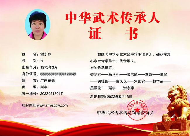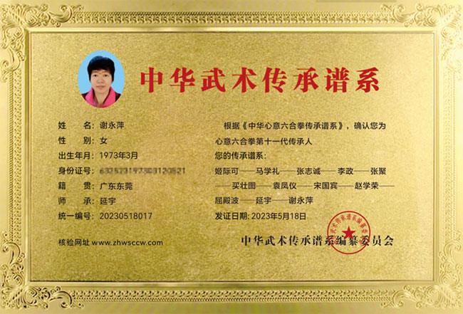 谢永萍,1973年生,广东东莞人,师承延宇——心意六合拳第十一代传人,武术协会理事成员,荣获优秀教练员荣誉称号。