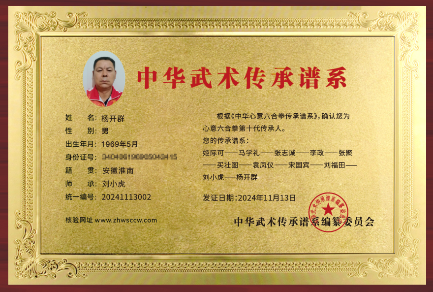 淮南市心意六合拳武协副会长,潘集区武协主席