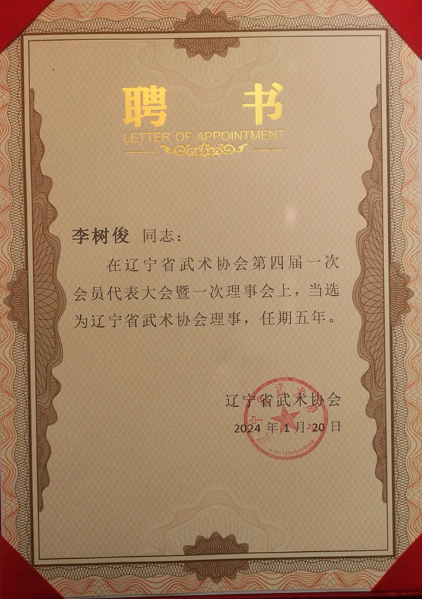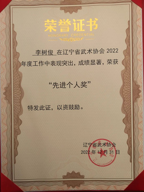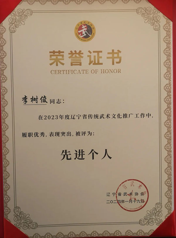 树俊武道馆连续三年被辽宁省武术协会评为“先进单位”、“优秀武术段位考试点”,馆长李树俊被评为武术工作“先进个人”。