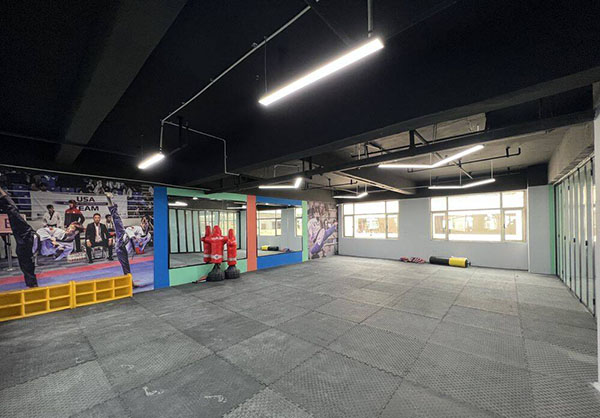 功能区:场地分为跆拳道训练区、搏击训练区、格斗训练区、青少年体适能区域和综合健身房。