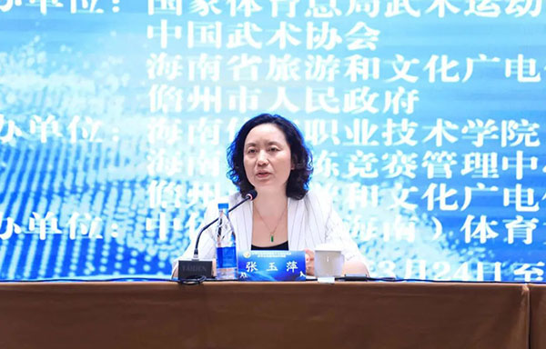 2025年3月24日,第十五届全国运动会武术比赛裁判员培训班在海南省儋州市开班。来自全国32个单位的191名武术套路和武术散打裁判员报名参训。国家体育总局武术运动管理中心主任、党委书记、国家体育总局武术研究院院长、国际武术联合会秘书长张玉萍,海南省旅游和文化广电体育厅党组成员、副厅长李海钢,海南省儋州市人民政府党组成员、副市长朱江出席开班仪式。仪式由国家体育总局武术运动管理中心副主任、国家体育总局武术研究院副院长李永强主持。