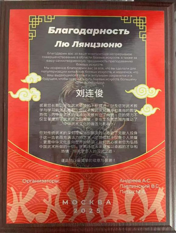 各国武术界非常认可沧州武术以及沧州的武术家们。这次俄罗斯武术比赛组委会为刘连俊颁发的证书上,用中俄文字写到:“您的努力不仅显著提升了武术技艺的高度,更在世界范围内推动了中华武术文化的普及与影响……您的成就不仅是个人荣耀,更是中华文化走向世界的桥梁。”