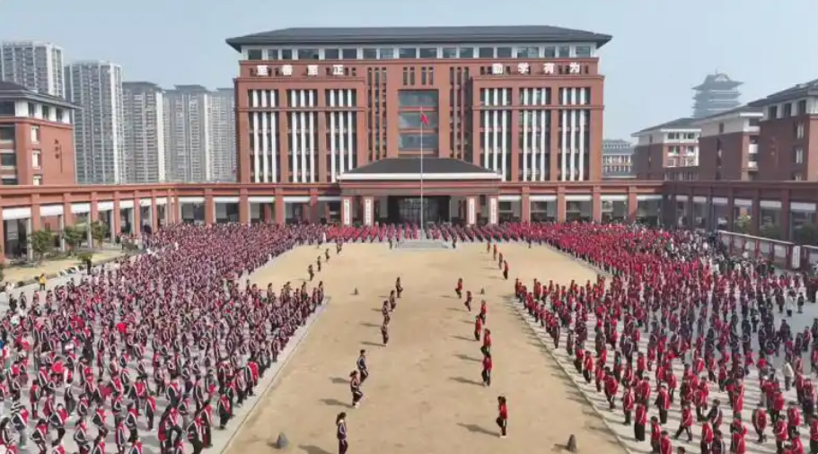 “叮铃铃”,随着大课间铃声敲响,三千余名学生迅速列队集结。伴随着激昂雄壮的武术操音乐,学生们化身为一个个小小的“武林高手”,挺拔跨立,时而气沉丹田,时而吼声震天,弓步冲拳、侧身踢腿、转身劈掌……一招一式整齐划一、刚劲有力,展现出蓬勃的朝气与活力,将中国传统武术的恢宏气势演绎得淋漓尽致。