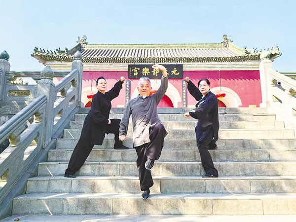 覃献平(中)带领学员在武当山静乐宫前练习武当武术
