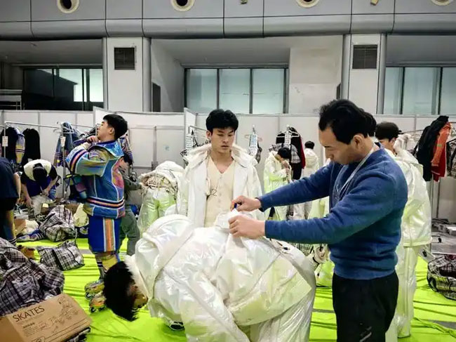 值得一提的是,塔沟武校42名学员用身体展现五十余种冰雪运动的经典姿态,向亚冬会全体参赛健儿致以独特敬意。按照导演别具匠心的创意,他们右腿需穿上特制的、固定于地面的“铁鞋”,在既定阵型里,行云流水般演绎蹬冰、燕式转、弓身转等50多种冰雪运动的标志性动作。塔沟武校教练张志豪介绍:“许多动作要求大幅度倾倒,这对学员们的腿部、腰腹力量考验极大,更需要他们具备吃苦耐劳、顽强拼搏的精神。导演组选定我们参演,这既是幸运更是挑战。”