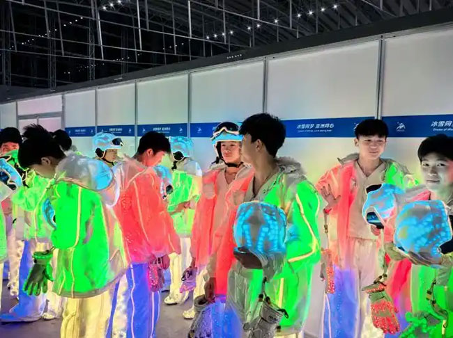 在节目表演过程中,塔沟武校的42名学员还需身着重达30斤的特制服装,从着装到演出结束下场,全程约两小时。学员陈明立介绍,服装内置六块电池,每次上场前都有专业人员协助穿戴并测试电源,穿好后密不透风。表演时不仅要完成各类高难度动作,服装还会变换灯光。“电源开启后,体感温度约40度,站着不动都会出汗。每次下场全身湿透,但只要节目出色,一切付出都值得。”