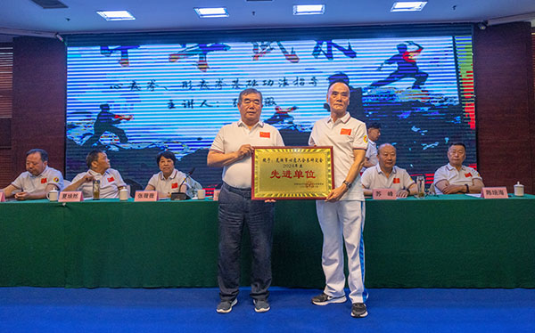 安徽省武术协会名誉主席,安徽省心意六合拳委员会赵新民会长给芜湖市心意六合拳研究会颁发2024年度先进单位奖牌。