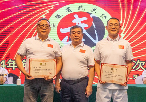 安徽省武术协会名誉主席,安徽省心意六合拳委员会赵新民会长给胡永标、杜斌两名副会长颁发聘书。
