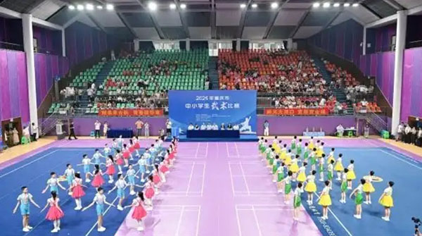 武术,是中华文明的瑰宝,承载着千年的文化底蕴与民族精神。5月15日,2025年重庆市中小学生武术比赛开幕式在大渡口区体育馆举行。来自重庆24个区县、55所中小学校的58支队伍共438名武术小将参赛。