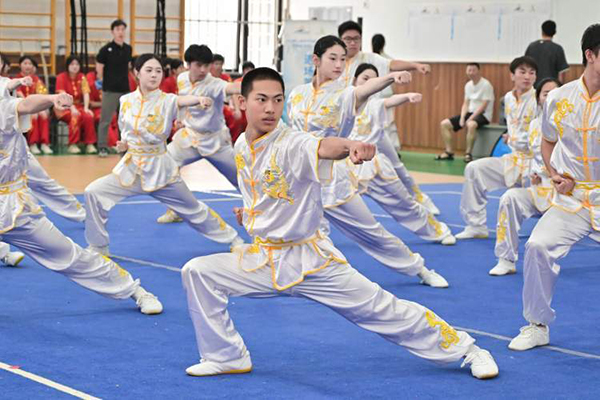 比赛现场,各校选手身着统一服装,每一个动作都整齐划一,展现出良好的精神面貌。随着音乐的激昂节奏,选手们时而挥拳有力,时而踢腿迅猛,将武术的阳刚之美演绎得淋漓尽致;时而又迅速变换队形,通过精妙的配合和协调,完美诠释了团队之间的协作精神。
