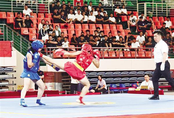 比赛现场,随着裁判员一声令下,首场对决即刻展开。选手们目光如炬、拳脚生风,直拳迅猛有力、鞭腿虎虎生威。当选手成功施展抱摔动作、将对手放倒在地时,看台上瞬间爆发出雷鸣般的掌声和喝彩声。