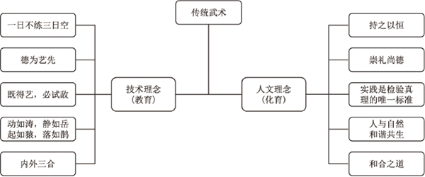 有着深厚历史积淀的传统武术是武技与文化的完美结合,应通过传授传统武术的技术理念发挥其人文化育功能,构建“以技强人、以文化人”为核心的传统武术文化话语体系(图1)。新时代新征程,传统武术文化须摒弃“传男不传女”的性别偏见、“理入”“行出”的唯心主义观念、“刀枪不入”的神秘化误导等糟粕,系统完善、提炼其富有教育意义的理论内涵,树立与新时期发展形势和目标相一致的价值理念。“冬练三九、夏练三伏”的坚忍不拔;“由招熟而渐悟懂劲,由懂劲而阶及神明”的自我修炼;“德为艺先、术道并重”的道德情操;“以柔克刚、后发先至”的冷静沉着等都是在传统武术实践中,习练者不断体验并阐发的技术理念与人文理念的整体观,既是内求外修的双向联动过程,又是追求自我完善与精神升华的必经之路。传统武术作为一种“以术求道”的教化资源,对其教化理念的挖掘与运用为新时代中国武术文化的“两创”提供了必要的理论基础。