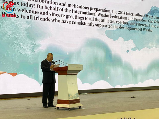 开幕式现场,在全场嘉宾以及全球多个国家及地区的代表队的见证下,运动员代表与裁判员代表分别进行了庄严宣誓,承诺将秉持公平、公正、公开的原则参与比赛,确保大赛的顺利进行。在国际武术联合会副主席吴廷贵的宣布下,2024年国际咏春拳大赛正式开幕。