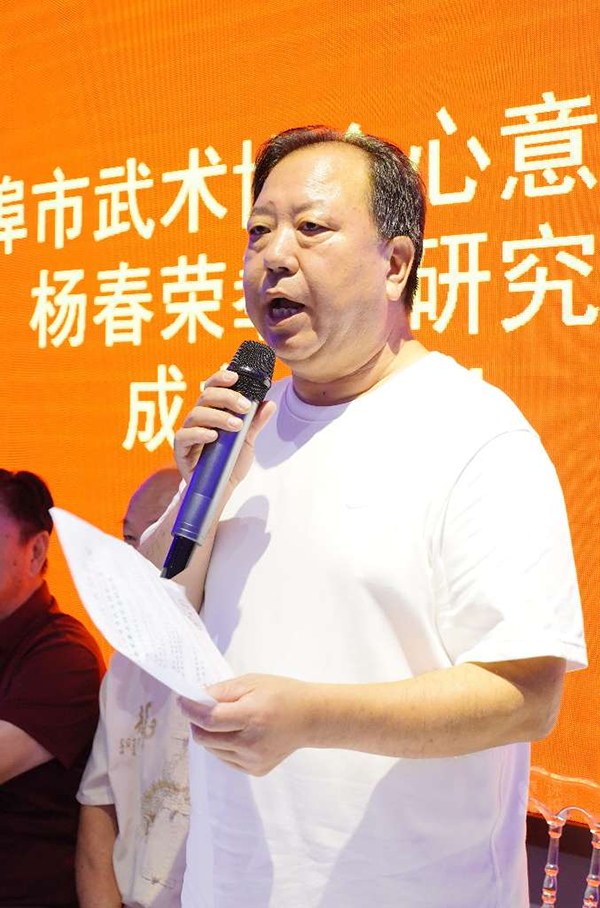 蚌埠市武术协会心意六合拳扬春荣拳术研究会会长杨宝全先生代表研究会发表了答谢感言并作了对未来充满热情和自信的讲话。