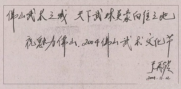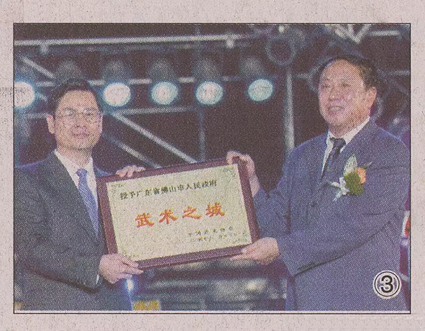 时任国家体育总局副局长于再清亲手题词并刊发于佛山日报:“佛山武术之城,天下武林英豪向往之地。”