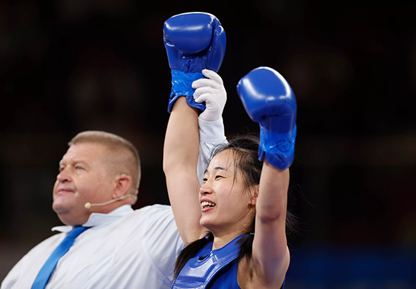 2023年8月3日,中国散打选手李志勤(右)在成都大运会获胜夺冠后庆祝。