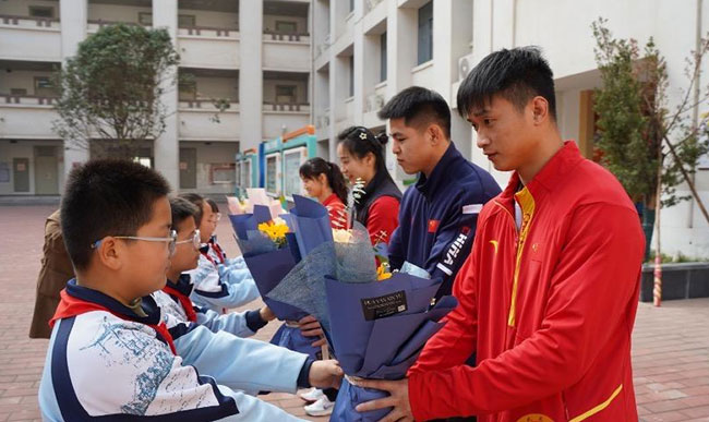 2024年全国武术散打冠军赛于10月24日至29日在河南省漯河市举办。10月28日下午,“武术散打冠军进校园”活动在漯河市源汇区第三实验小学隆重举行,武术散打冠军运动员林宏伟、李勐凡、李志勤、杜玉霞与学校的同学们开展以“冠军进校园,少年共成长”为主题的健身指导活动,为同学们讲述他们成长的故事,并与学生互动交流,传递榜样力量。本次活动得到了河南省武术体操冰雪运动中心、漯河市体育局、漯河市教育局、源汇区教育局的大力支持。