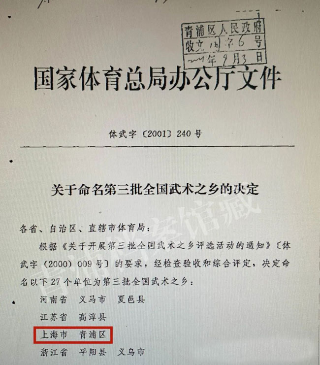 2000年,青浦区被国家体育总局命名为“第三批全国武术之乡”