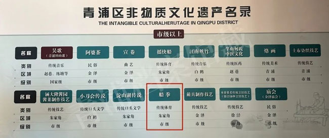 船拳作为青浦的优秀传统文化和特色武术运动,在进入21世纪后,起源于朱家角的船拳被列为上海市市级非物质文化遗产。