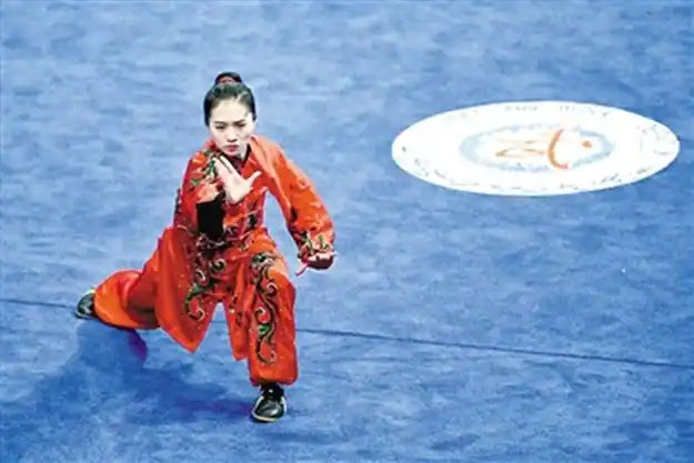 ▲在第十一届全国少数民族传统体育运动会上,新疆代表队运动员地里娜尔在民族武术项目比赛中