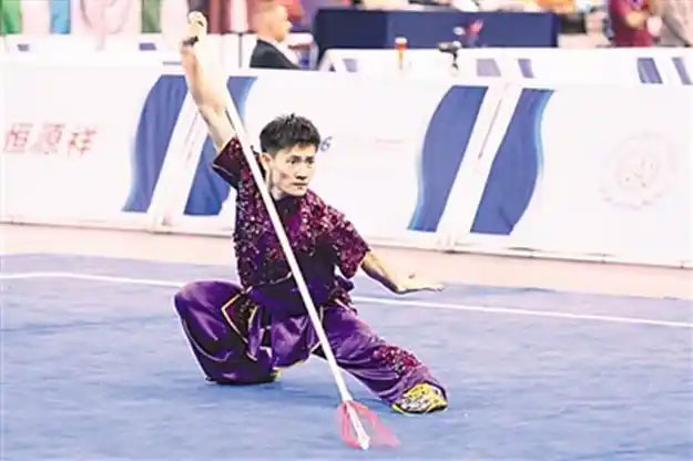 ▲在第十六届世界武术锦标赛上,中国选手张清淳在男子枪术比赛中