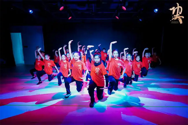 踏着充满节奏感的街舞舞步,穿着印有金色“功夫”字样红色上衣的孩子们粉墨登场。一番热血澎湃的唱跳表演完成后,部分孩子换上传统武术比赛服,上演了集体拳术(长拳)、太极拳、刀术和剑术表演。当武术的刚劲有力遇见音乐剧的灵动优美,这群6—14岁青少年的自信身姿,是他们过去两周下足功夫的明证。