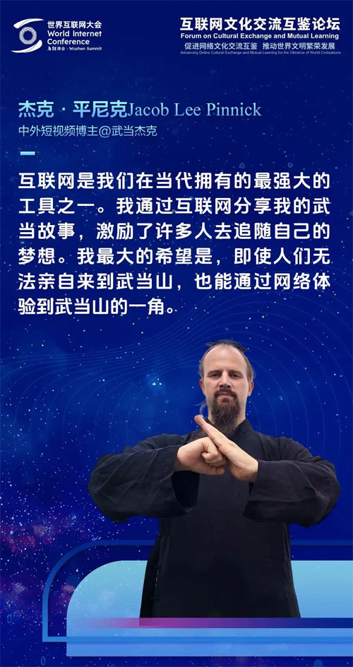 “毋庸置疑的是,互联网是我们在当代拥有的最强大的工具之一……我通过互联网分享我的武当故事,激励了许多人去追随自己的梦想。”11月21日,中外短视频博主杰克·平尼克(Jake Pinnick),在浙江乌镇举行的2024年世界互联网大会乌镇峰会互联网文化交流互鉴论坛上向观众分享了自己的创作感悟。