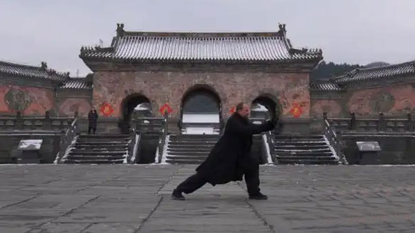 嘴上留胡须,身穿练功服,舞完剑法再练拳术,刚柔并济,轻盈自如。要不是外貌特征,远远望去很难相信,这个在武当山脚下把中国武技做到行云流水的人是个外国人。