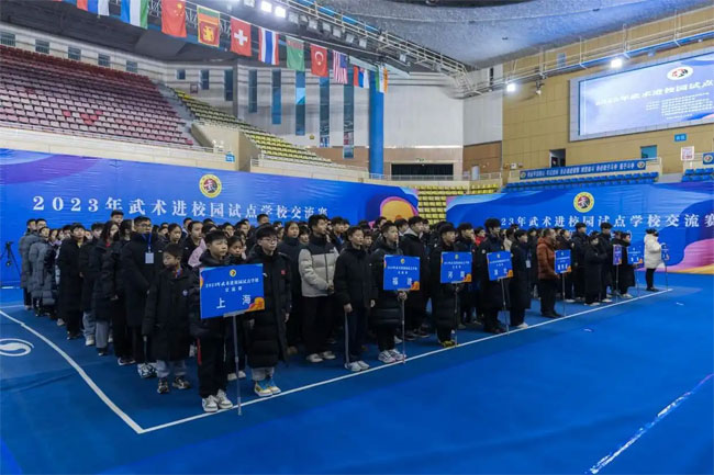 2023年武术进校园试点学校交流赛3日在湖北省十堰市武当国际武术交流中心开赛。共有来自上海、湖北、重庆、河南、广东、云南、福建七个省市、69所学校的300余名运动员齐聚武当,展开为期两天的激烈角逐。