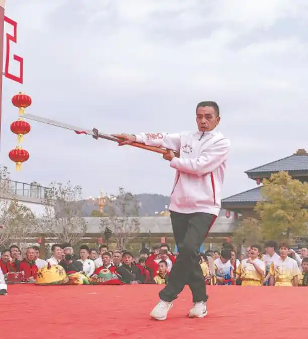 活动现场,伴随着激昂的音乐,武术队员们轮番上阵,各展绝技。从刚劲有力的连城拳、梅花拳、客家拳、四门拳传统拳术,到行云流水的螳螂双手剑、大刀、棍术等器械套路(如图),一招一式都尽显中华武术的博大精深。精彩的表演赢得现场观众的阵阵掌声和喝彩。
