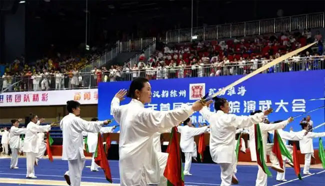 开幕式上,演武大会进行了主题为“丝路汉风、武动全球”的武术表演。徐州市武术协会太极功夫扇表演队表演了“太极神韵”太极功夫拳扇,徐州丰县梁寨中学形意拳表演队进行了集体形意拳表演,徐州市武术协会健身气功专业委员会成员表演了健身气功集体八段锦,徐州市武术协会八卦太极刀队表演了集体八卦太极刀……他们的精彩演出,为这次四省武术大赛开幕式增添又一个亮点。