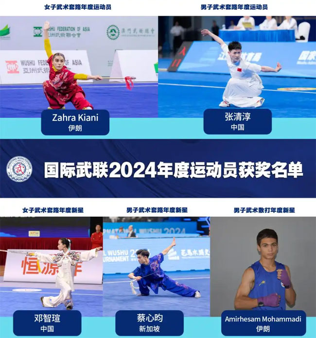 27日,国际武术联合会公布2024年度运动员奖项评选结果:中国选手张清淳获得男子武术套路年度运动员,15岁的邓智瑄获得女子武术套路年度新星;伊朗的扎赫拉·基亚妮和阿米尔赫萨姆·默罕默迪分别获得女子武术套路年度运动员和武术散打年度新星;新加坡的蔡心昀获得男子武术套路年度新星。