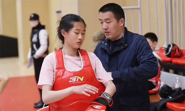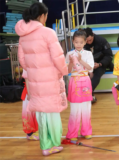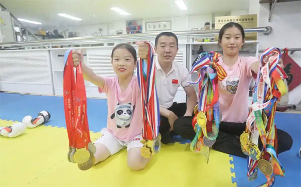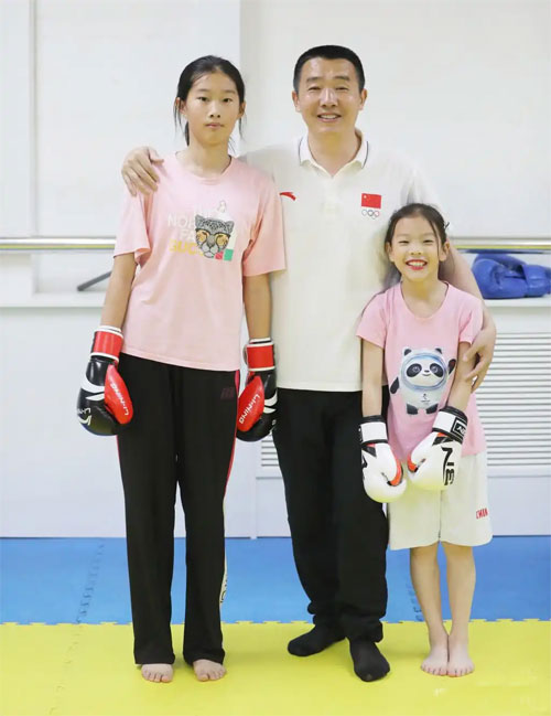 小万的两个女儿都是青岛市的武术、散打冠军,其中小女儿王忆楚还取得过山东省的体操冠军。如今改了项目从事武术套路,由于之前姐妹俩有过体育功底,领悟动作快,很快就被青岛市武术套路女队主教练陈静注意到她们运动的天赋,经过悉心指导后,已经是重点培养苗子,有望代表青岛参加明年在临沂举办的省运会的武术套路比赛。