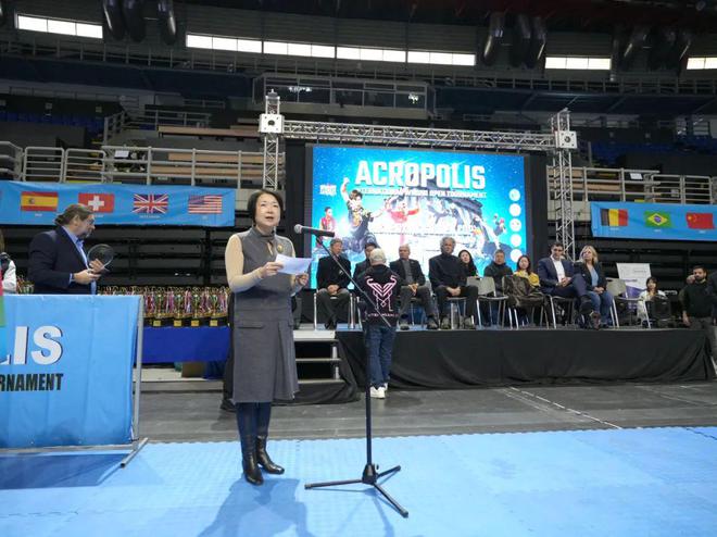 王滢参赞代表方遒大使对本次武术赛事的举办表示衷心的祝贺。她指出,中国和希腊同为文明古国,古老的智慧为解决当今世界的问题提供了借鉴。中希两国为推动世界文明的发展和进步作出了重要贡献。如今,武术交流已成为两国文明互鉴的重要载体。