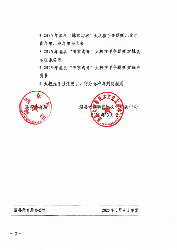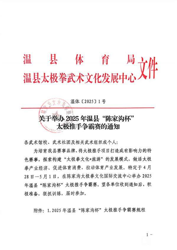 为培育我县赛事品牌,将太极推手项目打造成有影响力的特色赛事,探索构建“太极拳文化+旅游”的发展模式,做活太极拳产业经济、促进体育消费,拉动体育产业发展。特定于4月28日—5月1日,在陈家沟太极拳文化国际交流中心举办2025年温县“陈家沟杯”太极推手争霸赛。望各单位收到通知后,积极准备,狠抓训练,届时参加。
