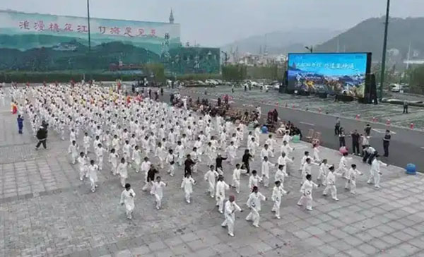 4月20日上午桃花江竹海游客中心前坪化身“天然演武场”来自全省的19支队伍800余名太极拳爱好者在万亩竹林背景下以拳会友施展风采活动现场,参演者以竹海游客中心为圆心展开队列,起势、野马分鬃、白鹤亮翅等 -