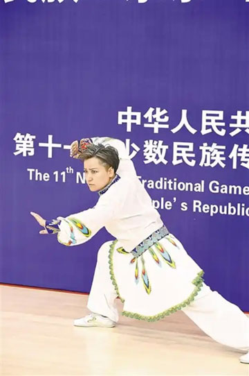 ▲在第十一届全国少数民族传统体育运动会上,新疆代表队运动员地里娜尔在民族武术项目比赛中